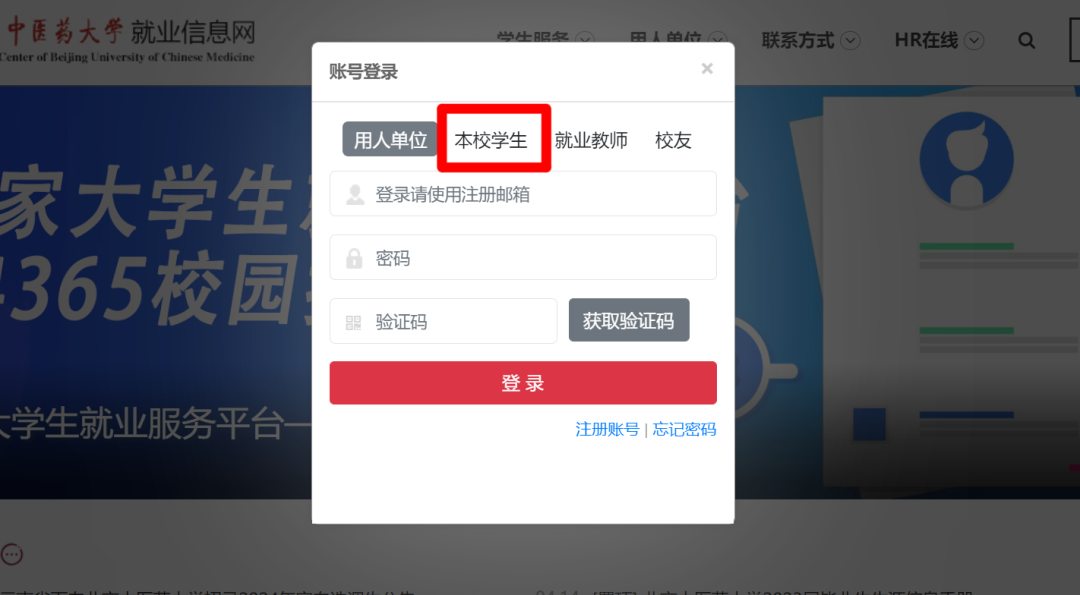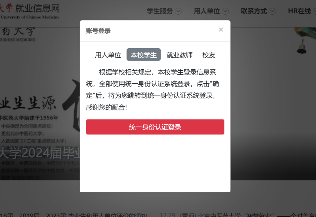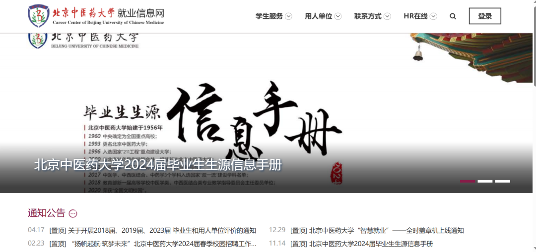 1) 可输入网址://jy.spbo1tq.com/,进入北京中医药大学就业信息网登录页面