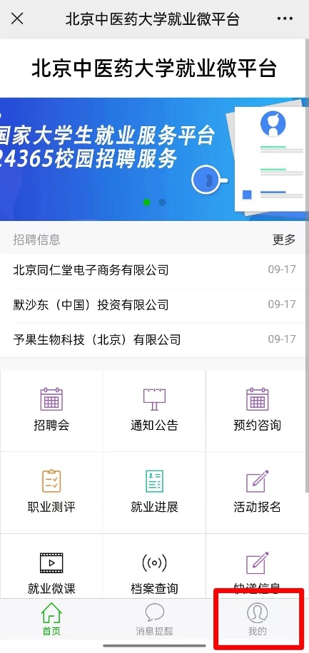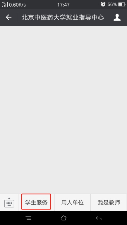 打开“北京中医药大学就业指导中心”微信公众号,选择下方的“学生服务”选项