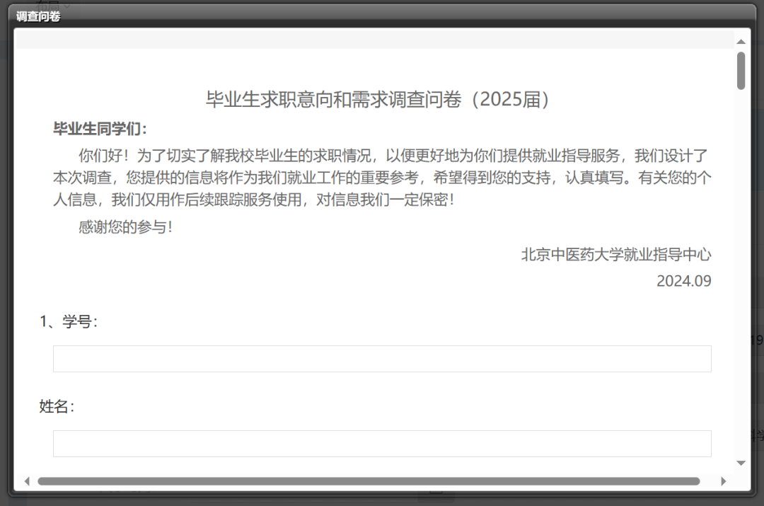 此时系统会弹出“毕业生求职意向和需求调查问卷”,此问卷非定向毕业生必须填写,否则无法完成基本信息核对。填写完成后记得点击左下方“确认提交”按钮,完成问卷调查