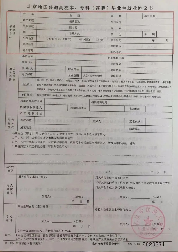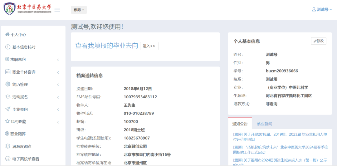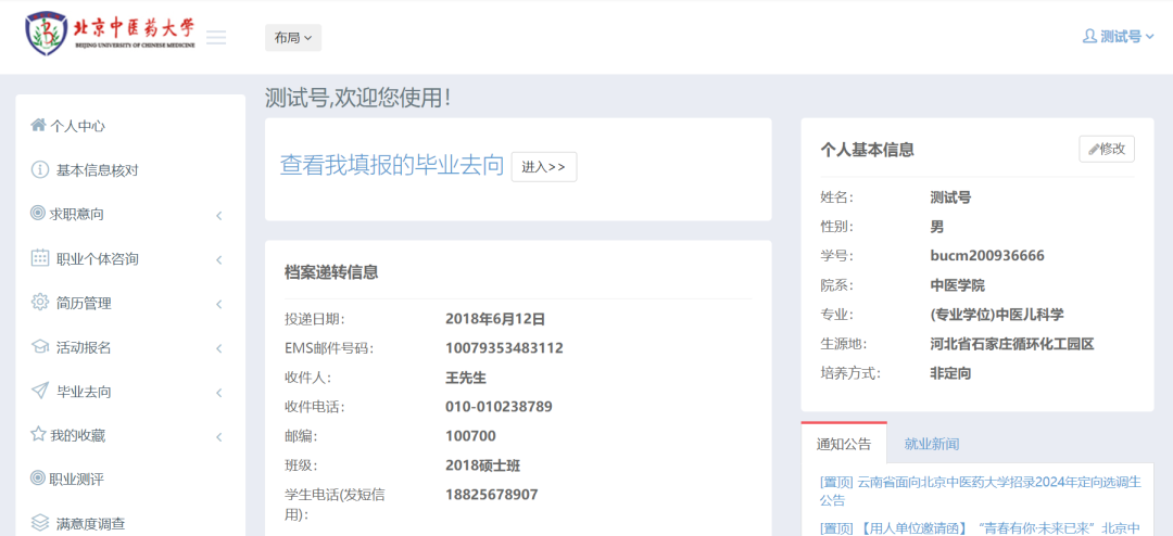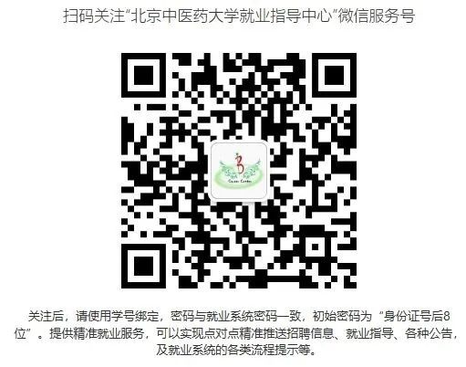 核对本人信息而且确认无误之后,在基本信息最下方是“北京中医药大学就业指导中心”微信服务号,可扫描下方二维码关注。