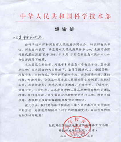 北京中医药大学 “中医四诊合参辅助诊疗仪”科研团队应邀参加北戴河全国科技成果巡展收到科技部感谢信