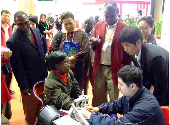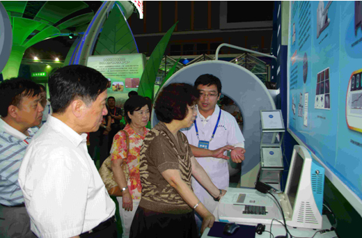 历次展会都备受社会各界的重视和关注,有众多国内群众和国外代表体验了数字化的、量化的中医诊断(图2、3、4、5)。中共中央政治局委员、国务委员刘延东,原党和国家领导同志宋平、李岚清、曾庆红、宋健,科技部和河北省委、省政府领导同志等亲临我校展台参观并询问有关研发情况(见图6、7、9),“中医四诊合参辅助诊疗仪”受到了科技部的高度赞扬。